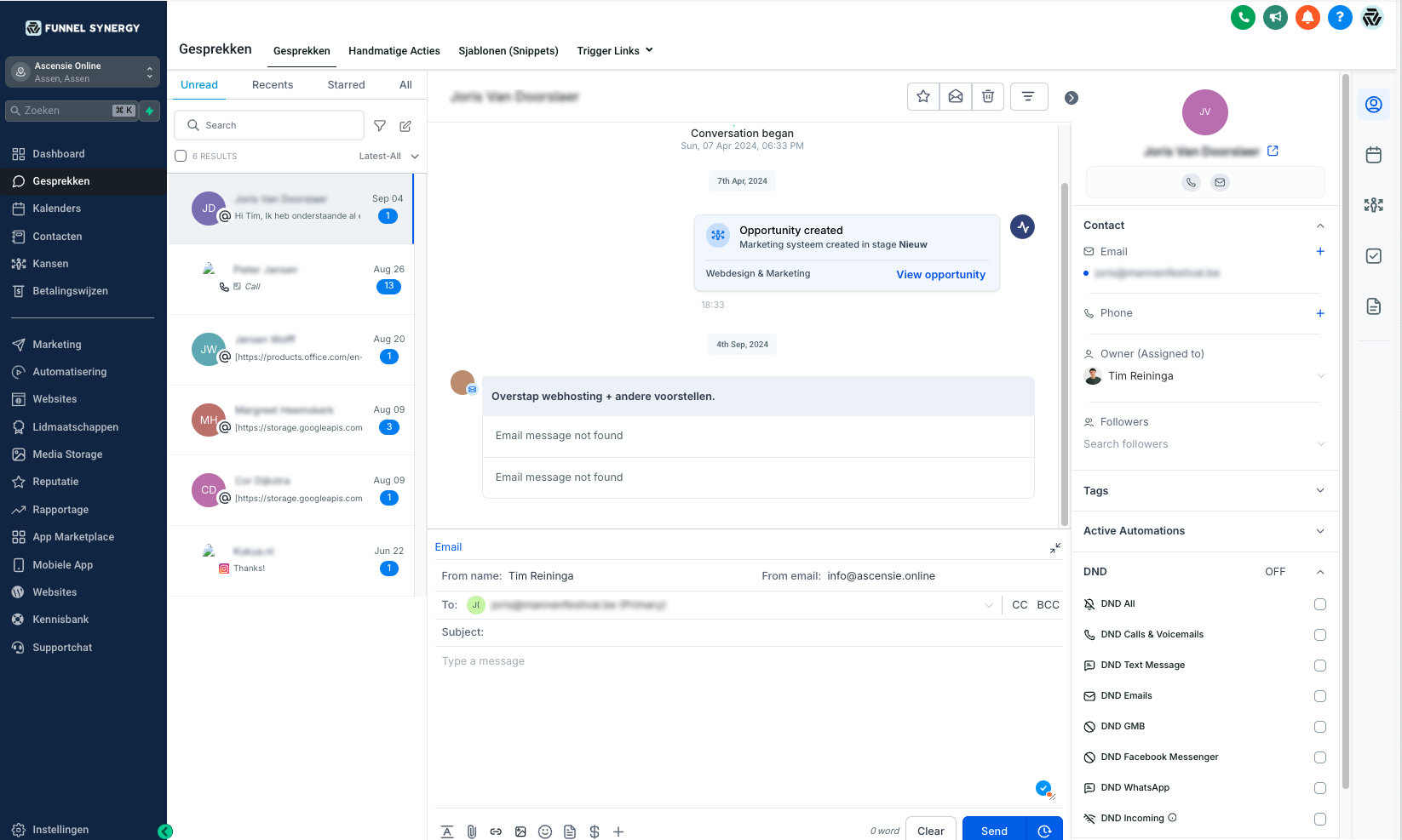 De centrale berichten inbox module van Funnel Synergy biedt een krachtige oplossing om al je klantcommunicatie op één plek te beheren. Met deze module kun je berichten van verschillende kanalen, zoals e-mail, sms, chat en sociale media, centraliseren in één overzichtelijke inbox. Hierdoor mis je nooit meer een bericht en kun je snel en efficiënt reageren op vragen of opmerkingen van klanten, ongeacht waar het bericht vandaan komt.