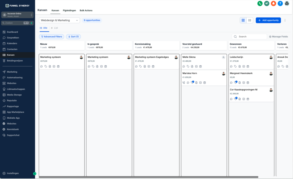 De sales pijplijnen module van Funnel Synergy biedt een krachtige manier om je verkoopproces te visualiseren en te beheren. Met deze module kun je elke fase van je sales traject in kaart brengen, van lead tot klant, zodat je altijd weet waar iedere prospect zich bevindt in het proces. Door het gebruik van een visueel overzicht kun je eenvoudig je verkoopkansen beheren, taken toewijzen aan je team en acties ondernemen om deals sneller te sluiten.