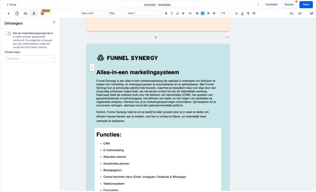 De offerte- en documentenmodule van Funnel Synergy is een krachtige tool die je in staat stelt om eenvoudig professionele offertes en documenten te maken, versturen en beheren. Met deze module kun je moeiteloos maatwerkoffertes opstellen voor klanten, volledig in je eigen huisstijl. Zodra de offerte is verstuurd, kun je realtime volgen wanneer de klant deze opent en bekijkt, waardoor je inzicht hebt in hun interesse.